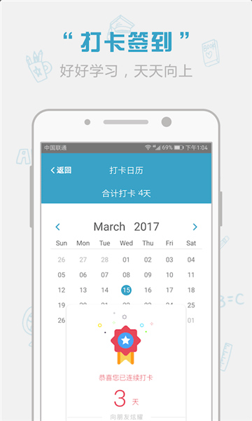 1、【打卡日历】:每日签到,记录学习情况,通过考勤,督促用户坚持学习。