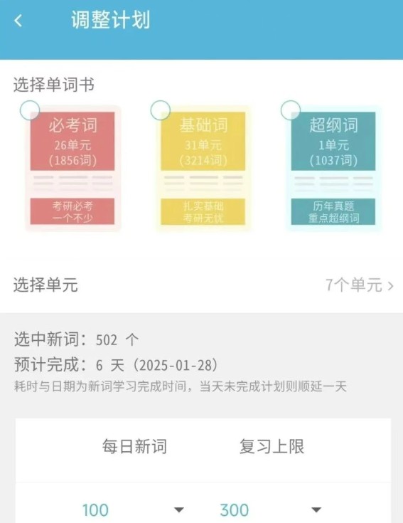 5、【调整计划】:用户可根据自身情况,对《红宝书考研英语词汇》必考词(26个单元)、基础词(30个单元)、超纲词(A-D)灵活制定学习计划。