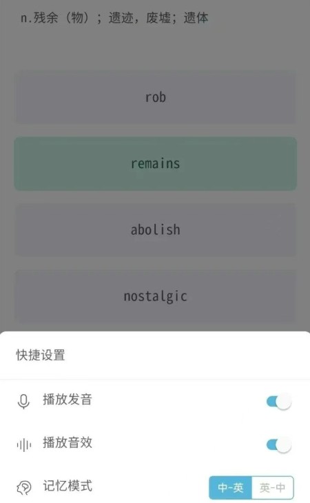 2、【记忆模式】:“中——英”和“英——中”两种方式复习记忆单词。