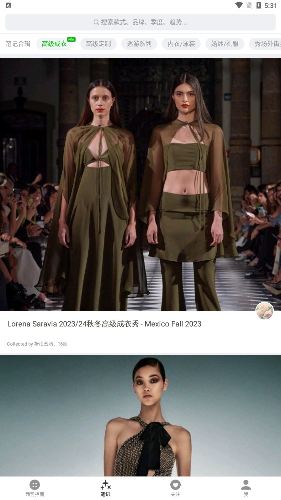 1、在首页中,可以看到数万篇时装笔记,涵盖秀场、街拍、Lookbook等,还可以查看各个年度有关时装的笔记;在上方的搜索栏中可以进行款式、品牌、季度以及趋势等的搜索;