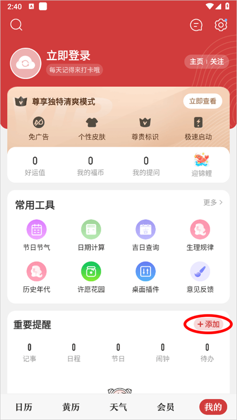2、在我的页面中找到重要提醒点击后方的添加;