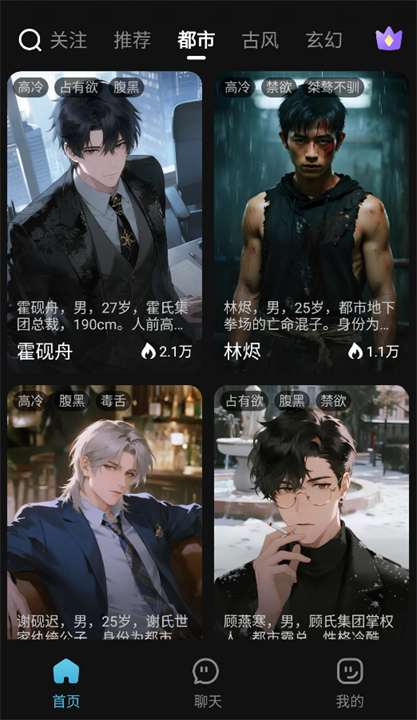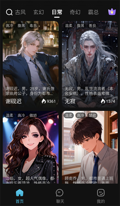 1、涵盖都市、古风、奇幻、校园、霸总等丰富题材角色。
